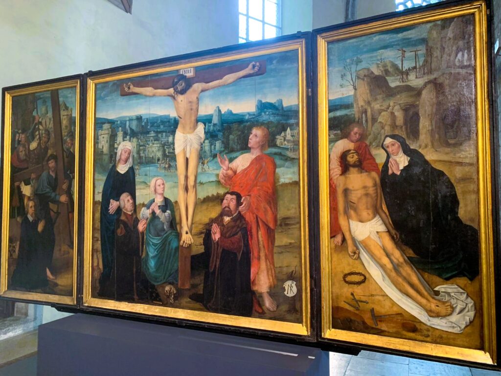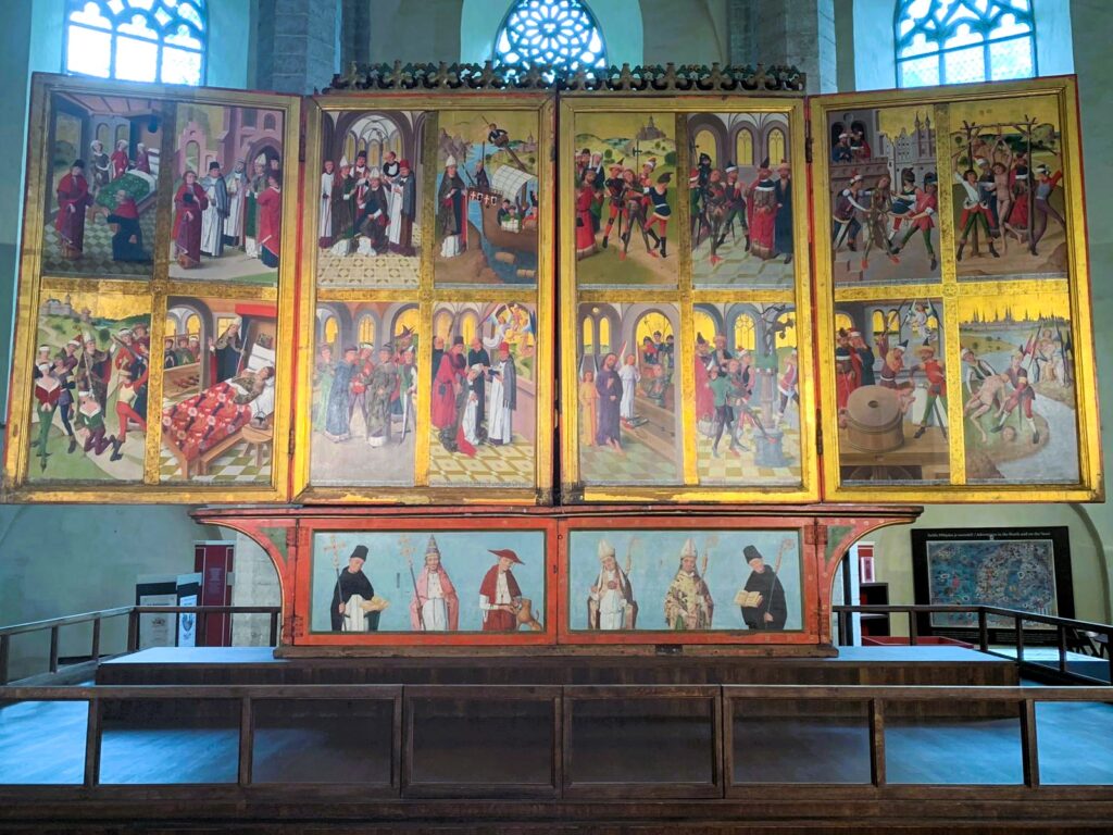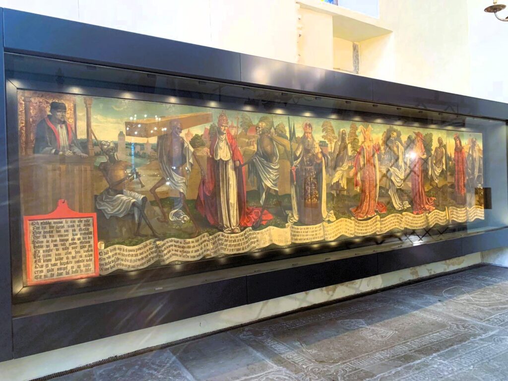 E poi, all’interno della Chiesa, oltre a pale d’altare e altri quadri, spicca il dipinto di Bernt Notke “Danza della Morte”, dove i simboli del potere terreno (il Papa, l’Imperatore e sua moglie, il vescovo e il re) ballano, o forse sono trascinati da figure scheletriche che rappresentano la Morte.